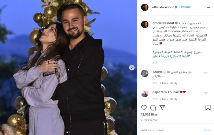 ونشر وسوف، صورًا لهما عبر حسابه على إنستجرام، وعلق: "ألف مبروك خطبة جورج جونيور وسوف وإيلينا سركيس على الطريقة ال moderne نظرًا للأوضاع الكورونية.. إن شاء الله بتتهنوا بحياتكن، وعقبال الفرحة الكبيرة حتى أصير جدو يا حبيب قلب البابا".