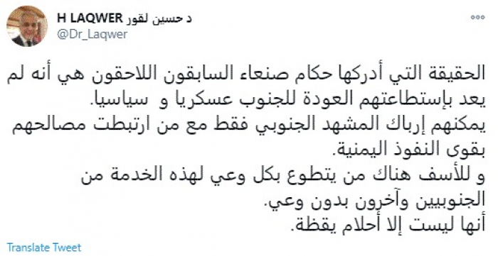 قلل المحلل السياسي الدكتور حسين لقور، اليوم، من محاولات حكام صنعاء بالعودة للجنوب، مؤكدًا أنها "أحلام يقظة".