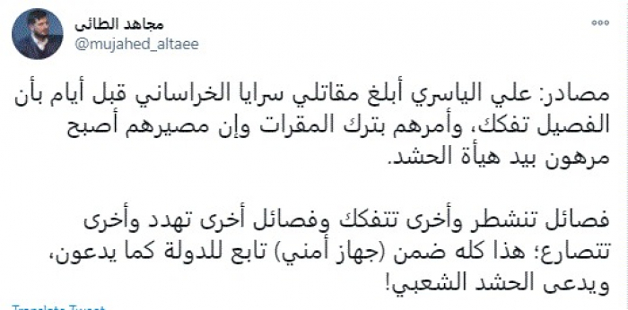 وقال في تغريدة عبر "تويتر" رصدها "المشهد العربي": "مصادر: علي الياسري أبلغ مقاتلي سرايا الخراساني قبل أيام بأن الفصيل تفكك، وأمرهم بترك المقرات وإن مصيرهم أصبح مرهون بيد هيئة الحشد. فصائل تنشطر وأخرى تتفكك وفصائل أخرى تهدد وأخرى تتصارع؛ هذا كله ضمن (جهاز أمني) تابع للدولة كما يدعون، ويدعى الحشد الشعبي".