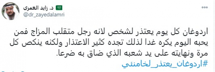 وقال في تغريدة عبر "تويتر" رصدها "المشهد العربي": "أردوغان كل يوم يعتذر لشخص لانه رجل متقلب المزاج فمن يحبه اليوم يكره غدا لذلك تجده كثير الاعتذار ولكنه ينكص كل مرة ونهايته على يد شعبه الذي ضاق به ضرعا. أردوغان يعتذر لخامنئي".
