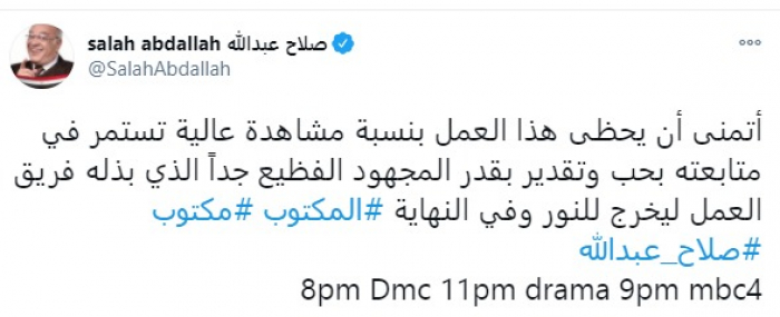 شوق الفنان القدير صلاح عبد الله، جمهوره لمسلسله الدرامي الجديد"جمال الحريم" تزامنا مع عرضه على شاشة "dmc".