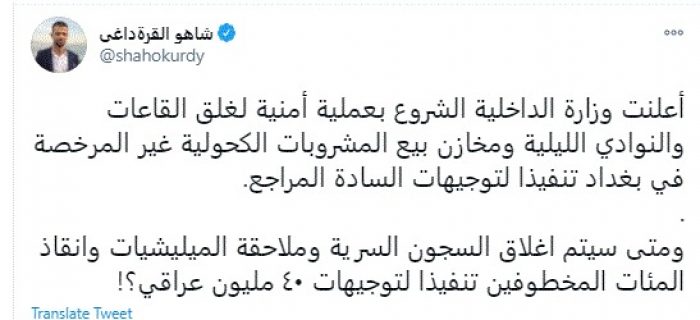 وقال في تغريدة عبر "تويتر" رصدها "المشهد العربي": "أعلنت وزارة الداخلية الشروع بعملية أمنية لغلق القاعات والنوادي الليلية ومخازن بيع المشروبات الكحولية غير المرخصة في بغداد تنفيذا لتوجيهات السادة المراجع".