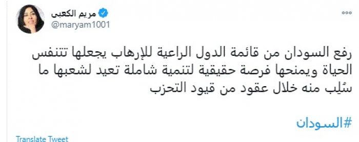 علقت الكاتبة والإعلامية الإماراتية مريم الكعبي، اليوم، على رفع اسم السودان من قائمة الدول الراعية للإرهاب.