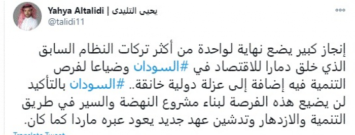 وكتب في تغريدة عبر "تويتر" رصدها "المشهد العربي": "إنجاز كبير يضع نهاية لواحدة من أكثر تركات النظام السابق الذي خلق دمارا للاقتصاد في السودان وضياعا لفرص التنمية فيه إضافة إلى عزلة دولية خانقة.. السودان بالتأكيد لن يضيع هذه الفرصة لبناء مشروع النهضة والسير في طريق التنمية والازدهار وتدشين عهد جديد يعود عبره ما ردا كما كان".