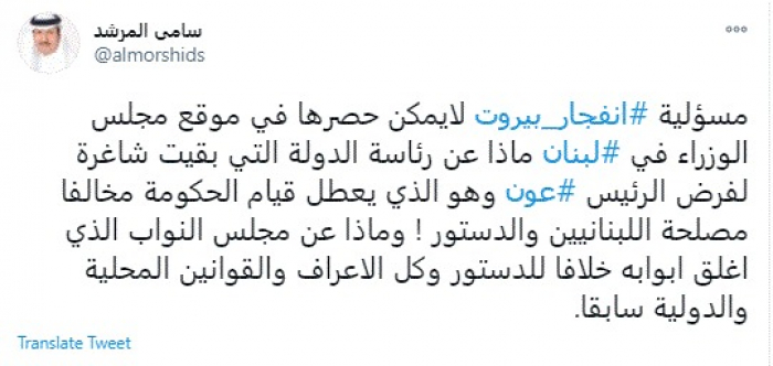 وكتب في تغريدة عبر "تويتر" رصدها "المشهد العربي": "مسؤولية انفجار بيروت لا يمكن حصرها في موقع مجلس الوزراء في لبنان ماذا عن رئاسة الدولة التي بقيت شاغرة لفرض الرئيس عون وهو الذي يعطل قيام الحكومة مخالفا مصلحة اللبنانيين والدستور".