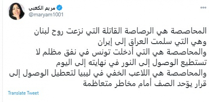 وقالت في تغريدة عبر "تويتر" رصدها "المشهد العربي": "المحاصصة هي الرصاصة القاتلة التي نزعت روح لبنان وهي التي سلمت العراق إلى إيران المحاصصة هي التي أدخلت تونس في نفق مظلم لا تستطيع الوصول إلى النور في نهايته إلى اليوم".