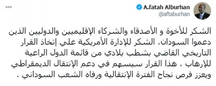 وقال في تغريدة على حسابه بموقع التدوين المصغر (تويتر)، اليوم، إن: "الشكر للأخوة و الأصدقاء والشركاء الإقليميين والدوليين الذين دعموا السودان".