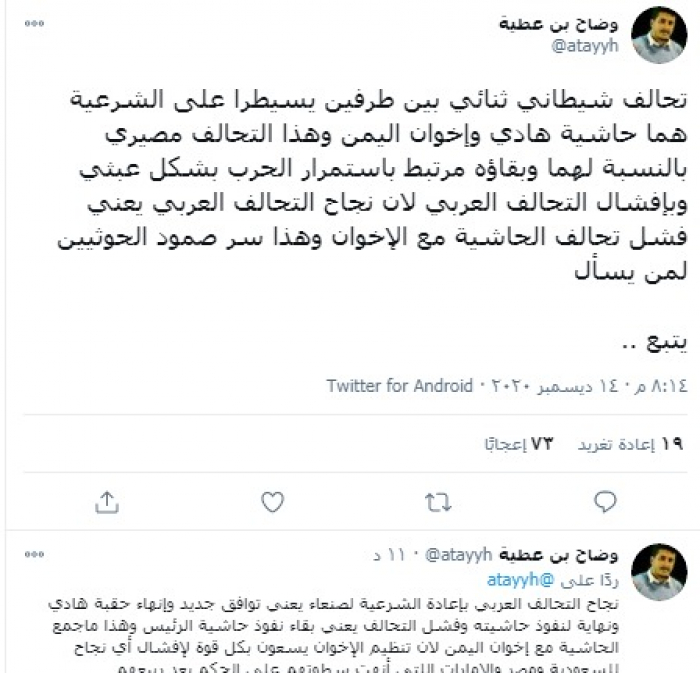 وأوضح أن: "فشل التحالف يعني بقاء نفوذ حاشية الرئيس وهذا ما جمع الحاشية مع إخوان اليمن لأن تنظيم الإخوان يسعون بكل قوة لإفشال أي نجاح للسعودية ومصر والإمارات التي أنهت سطوتهم على الحكم بعد ربيعهم".