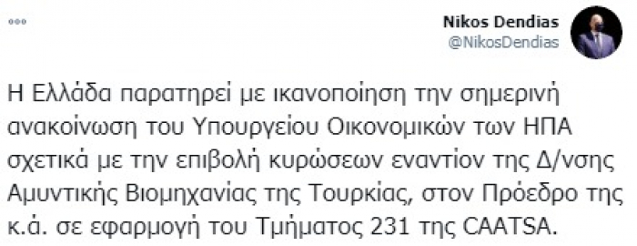 رحب وزير خارجية اليونان، نيكوس دندياس، بإعلان وزارة الخزانة الأمريكية فرض عقوبات على هيئة الصناعة الدفاعية التركية ورئيسها وآخرين.