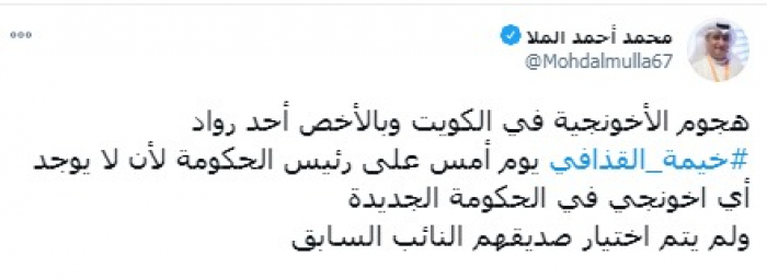 وشدد في تغريدة على حسابه بموقع التدوين المصغر (تويتر)، اليوم، على أن: "هجوم الإخونجية في الكويت وبالأخص أحد رواد خيمة القذافي يوم أمس على رئيس الحكومة لأن لا يوجد أي إخونجي في الحكومة الجديدة"، مضيفا: "لم يتم اختيار صديقهم النائب السابق".
