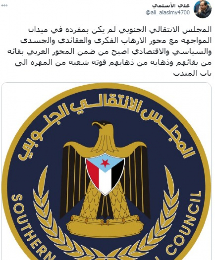 شدد الناشط السياسي علي الأسلمي، على أن المجلس الانتقالي الجنوبي أحد أركان المحور العربي لمواجهة الإرهاب.