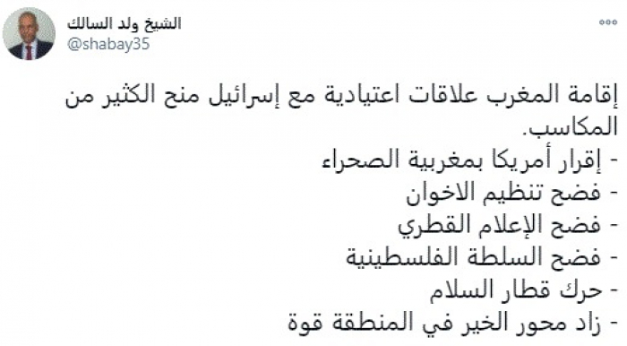 وقال في تغريدة عبر "تويتر" رصدها "المشهد العربي": "إقامة المغرب علاقات اعتيادية مع إسرائيل منح الكثير من المكاسب. إقرار أمريكا بمغربية الصحراء. فضح تنظيم الإخوان. فضح الإعلام القطري. فضح السلطة الفلسطينية. حرك قطار السلام. زاد محور الخير في المنطقة قوة".