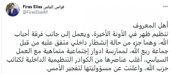 وقال في تغريدة عبر "تويتر" رصدها "المشهد العربي": "أهل المعروف تنظيم ظهر في الأونة الأخيرة، ويعمل إلى جانب فرقة أحباب الله، وهما جزء من حالة إنشطار داخلي متفق عليه من قبل جماعة ربع الله، لممارسة أدوار اجتماعية متماهية مع العمل السياسي، أغلب عناصرها من الكوادر التنظيمية الداخلية لكتائب حزب الله، واعلنت عن مسؤوليتها لتفجير الأمس".