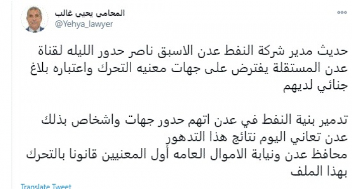 وقال في تغريدة عبر "تويتر" رصدها "المشهد العربي": "حديث مدير شركة النفط عدن الأسبق ناصر حدور الليلة لقناة عدن المستقلة يفترض على جهات معنية التحرك واعتباره بلاغ جنائي لديهم".
