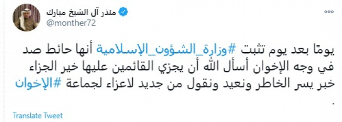 وقال في تغريدة عبر "تويتر" رصدها "المشهد العربي": "يومًا بعد يوم تثبت وزارة الشؤون الإسلامية أنها حائط صد في وجه الإخوان أسأل الله أن يجزي القائمين عليها خير الجزاء خبر يسر الخاطر ونعيد ونقول من جديد لا عزاء لجماعة الإخوان".