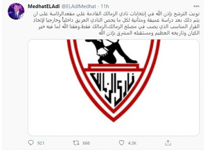 مدحت العدل يعلن ترشحه لانتخابات نادي الزمالك