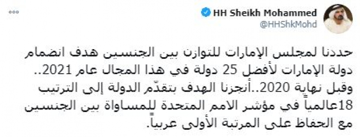 وقال في تغريدة على حسابه بموقع التدوين المصغر (تويتر)، اليوم، إننا: "حددنا لمجلس الإمارات للتوازن بين الجنسين هدف انضمام دولة الإمارات لأفضل 25 دولة في هذا المجال عام 2021".