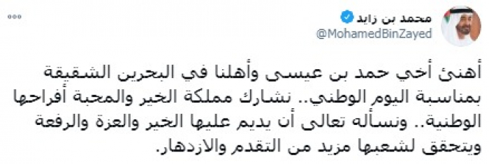 وقال في تغريدة على حسابه بموقع التدوين المصغر (تويتر): "أھنئ أخي حمد بن عیسى وأھلنا في البحرین الشقیقة بمناسبة الیوم الوطني".