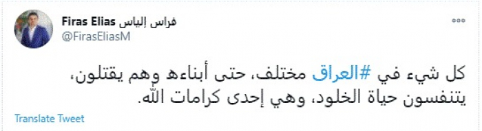 وقال في تغريدة عبر "تويتر" رصدها "المشهد العربي": "كل شيء في العراق مختلف، حتى أبناءه وهم يقتلون، يتنفسون حياة الخلود، وهي إحدى كرامات الله".