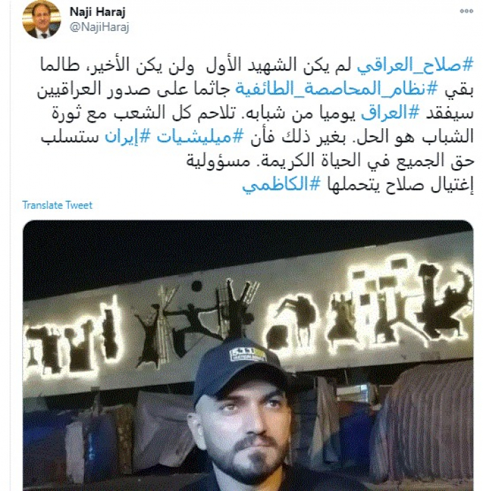 وقال في تغريدة عبر "تويتر" رصدها "المشهد العربي": "صلاح العراقي لم يكن الشهيد الأول ولن يكن الأخير، طالما بقي نظام المحاصصة الطائفية جاثما على صدور العراقيين سيفقد العراق يوميا من شبابه".