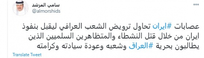 وكتب في تغريدة عبر "تويتر" رصدها "المشهد العربي": "عصابات إيران تحاول ترويض الشعب العرافي ليقبل بنفوذ إيران من خلال قتل النشطاء والمتظاهرين السلميين الذين يطالبون بحرية العراق وشعبه وعودة سيادته وكرامته".