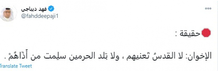 وقال في تغريدة عبر "تويتر" رصدها "المشهد العربي": " حقيقة.. الإخوان: لا القدسُ تَعنيهم ، ولا بَلد الحرمين سلِمت من أَذَاهُمْ".