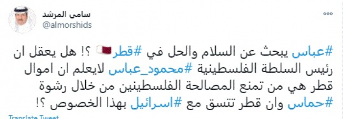 وقال في تغريدة عبر "تويتر" رصدها "المشهد العربي": "عباس يبحث عن السلام والحل في قطر؟! هل يعقل أن رئيس السلطة الفلسطينية محمود عباس لا يعلم أن اموال قطر هي من تمنع المصالحة الفلسطينين من خلال رشوة حماس وأن قطر تتسق مع إسرائيل بهذا الخصوص".