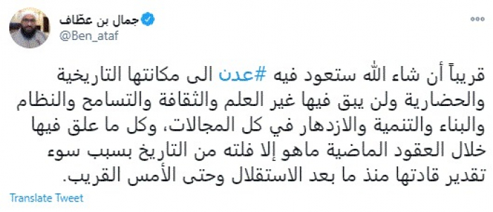 وكتب في تغريدة عبر "تويتر" رصدها "المشهد العربي": "قريبًا إن شاء الله ستعود فيه عدن إلى مكانتها التاريخية والحضارية ولن يبق فيها غير العلم والثقافة والتسامح والنظام والبناء والتنمية والازدهار في كل المجالات".