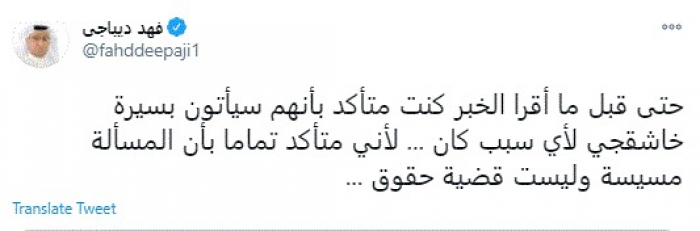 وقال في تغريدة عبر "تويتر" رصدها "المشهد العربي": "حتى قبل ما أقرا الخبر كنت متأكد بأنهم سيأتون بسيرة خاشقجي لأي سبب كان ... لأني متأكد تماما بأن المسألة مسيسة وليست قضية حقوق ".