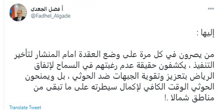 وكتب في تغريدة عبر "تويتر" رصدها "المشهد العربي": "من يصرون في كل مرة على وضع العقدة امام المنشار لتأخير التنفيذ، يكشفون حقيقة عدم رغبتهم في السماح لاتفاق الرياض بتعزيز وتقوية الجبهات ضد الحوثي، بل ويمنحون الحوثي الوقت الكافي لإكمال سيطرته على ما تبقى من مناطق شمالًا"