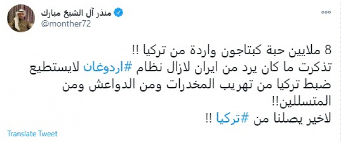 وقال في تغريدة عبر "تويتر" رصدها "المشهد العربي": "8 ملايين حبة كبتاجون واردة من تركيا تذكرت ما كان يرد من إيران لا زال نظام أردوغان لا يستطيع ضبط تركيا من تهريب المخدرات ومن الدواعش ومن المتسللين". لاخير يصلنا من تركيا".