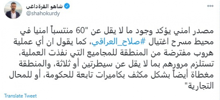 وقال في تغريدة عبر "تويتر" رصدها "المشهد العربي": "مصدر أمني يؤكد وجود ما لا يقل عن 60 منتسباً امنيا في محيط مسرح اغتيال صلاح العراقي، كما يقول ان أي عملية هروب مفترضة من المنطقة للمجاميع التي نفذت العملية، تستلزم مرورهم بما لا يقل عن سيطرتين أو ثلاثة، والمنطقة مغطاة أيضاً بشكل مكثف بكاميرات تابعة للحكومة، أو للمحال التجارية".