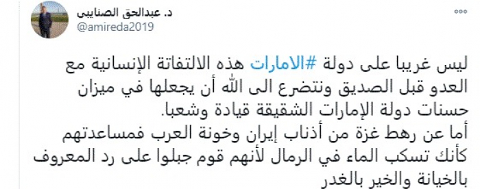 وأضاف: "أما عن ... غزة من أذناب إيران وخونة العرب فمساعدتهم كأنك تسكب الماء في الرمال لأنهم قوم جبلوا على رد المعروف بالخيانة والخير بالغدر".