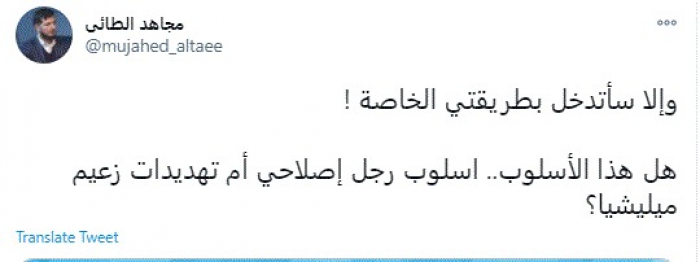 وقال في تغريدة عبر "تويتر" رصدها "المشهد العربي": "وإلا سأتدخل بطريقتي الخاصة! هل هذا الأسلوب.. أسلوب رجل إصلاحي أم تهديدات زعيم مليشيا؟".