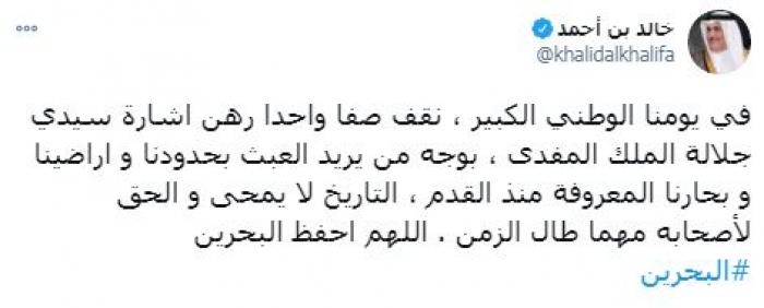وشدد على أن: "التاريخ لا يمحى والحق لأصحابه مهما طال الزمن"، مختتما "اللهم احفظ البحرين".