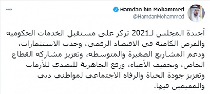 وقال في تغريدة على حسابه بموقع التدوين المصغر (تويتر) اليوم إن: "أجندة المجلس لـ2021 تركز على مستقبل الخدمات الحكومية والفرص الكامنة في الاقتصاد الرقمي، وجذب الاستثمارات، ودعم المشاريع الصغيرة والمتوسطة، وتعزيز مشاركة القطاع الخاص، وتخفيف الأعباء".