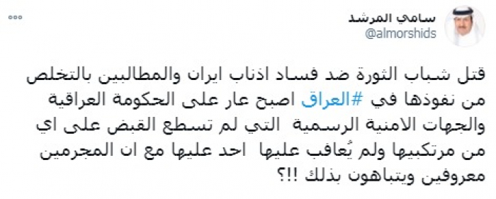 وقال في تغريدة على حسابه بموقع التدوين المصغر (تويتر) اليوم إن: "قتل شباب الثورة ضد فساد أذناب إيران والمطالبين بالتخلص من نفوذها في العراق، أصبح عار على الحكومة العراقية والجهات الأمنية الرسمية التي لم تستطع القبض على أي من مرتكبيها".