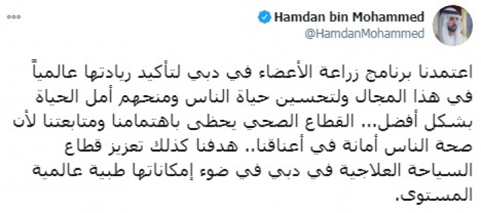 وقال في تغريدة على حسابه بموقع التدوين المصغر (تويتر) اليوم إننا: "اعتمدنا برنامج زراعة الأعضاء في دبي لتأكيد ريادتها عالميًا في هذا المجال ولتحسين حياة الناس ومنحهم أمل الحياة بشكل أفضل".