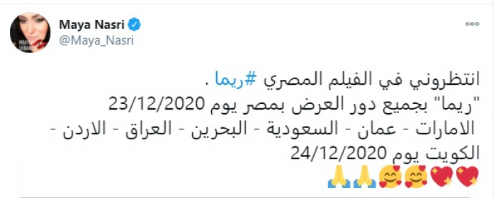 ونشرت مايا صورة لها من العمل، عبر حسابها الرسمي بموقع "تويتر"، وعلقت: "انتظروني في الفيلم المصري ريما، بجميع دور العرض بمصر يوم 23 ديسمبر، والإمارات وعمان والسعودية والبحرين والعراق والأردن والكويت يوم 24 ديسمبر".