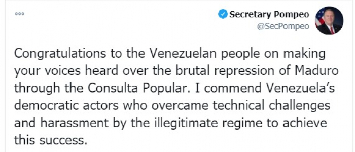 وكتب "بومبيو" تغريدة عبر حسابه بتويتر، رصدها "المشهد العربي": "تهانينا للشعب الفنزويلي على إسماع صوته بشأن القمع الوحشي لمادورو من خلال الاستفتاء الشعبي".