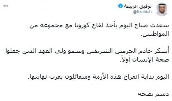طمأن وزير الصحة السعودي الدكتور توفيق الربيعة، المواطنين مع انطلاق حملة التحصين ضد كورونا، بأن الأزمة في نهايتها.