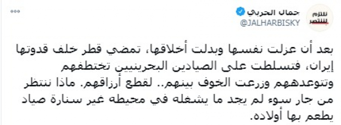 اتهم الإعلامي الإماراتي جمال الحربي، قطر باستهداف الصيادين البحرينيين بقطع أرزاقهم، أسوة بممارسات النظام الإيراني، مؤكدا أنها "جار سوء".