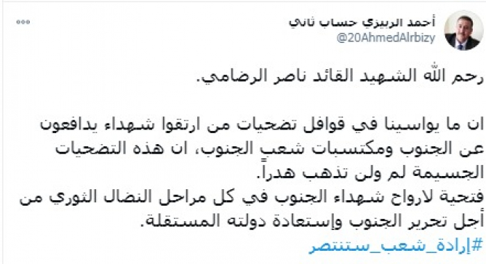 وقال في تغريدة على حسابه بموقع التدوين المصغر (تويتر): "رحم الله الشهيد القائد ناصر الرضامي، إن ما يواسينا في قوافل تضحيات من ارتقوا شهداء يدافعون عن الجنوب ومكتسبات شعب الجنوب، أن هذه التضحيات الجسيمة لم ولن تذهب هدرًا".