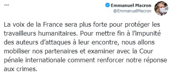 وقال ماكرون إنه: "سيكون صوت فرنسا أقوى لحماية عمال الإغاثة، لإنهاء إفلات مرتكبي الهجمات ضدهم من العقاب".