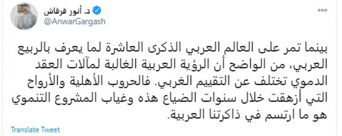 وأضاف: "سيُكتب الكثير حول ما يعرف بالربيع العربي وفي تقديري فإن الأهم هو تقييمنا العربي لهذا العقد الصعب واخفاقاته على أرض الواقع للشعوب. وسيكون حكم التاريخ عسيرا وبالغ القسوة من حيث خسائرنا البشرية والمعنوية والمادية والاقتتال الدموي الممتد في أكثر من دولة عربية".