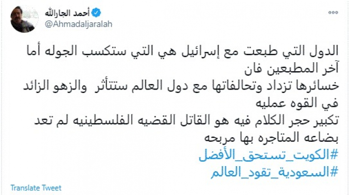 كشف عميد الصحافة الكويتية ورئيس تحرير صحيفة السياسة الكويتية أحمد الجارالله، اليوم، أهمية الاتفاقيات العربية مع إسرائيل.