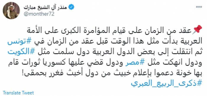 وصف المدون السعودي البارز منذر آل الشيخ مبارك، اليوم، الربيع العربي بالمؤامرة الكبرى على الأمة العربية.