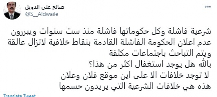 شن الناشط السياسي صالح الدويل، اليوم، هجومًا حادًا على الشرعية، واصفًا إياها بالفاشلة، مؤكدًا أنه يوجد خلافات بين قياداتها على تولي المناصب في الحكومة الجديدة.