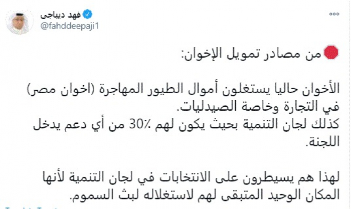 وقال في تغريدة عبر "تويتر" رصدها "المشهد العربي": "من مصادر تمويل الإخوان: الإخوان حاليا يستغلون أموال الطيور المهاجرة (اخوان مصر) في التجارة وخاصة الصيدليات. كذلك لجان التنمية بحيث يكون لهم ٪30 من أي دعم يدخل اللجنة".
