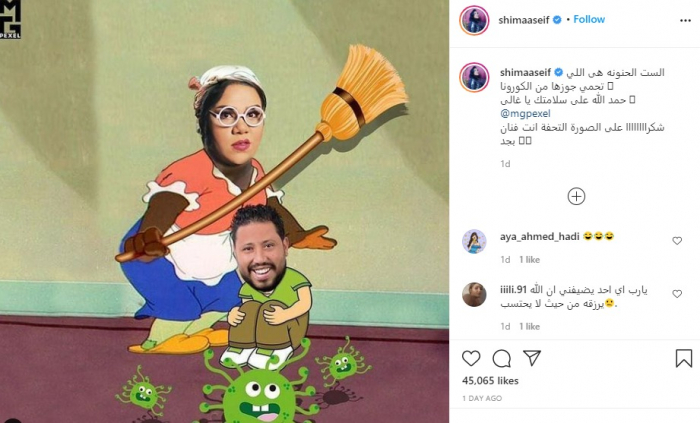 وأعلنت شيماء عن شفاء زوجها من فيروس كورونا، وعلقت على الصورة قائلة: "الست الحنونة هي اللي تحمي جوزها من كورونا، حمد الله على سلامتك يا غالي".